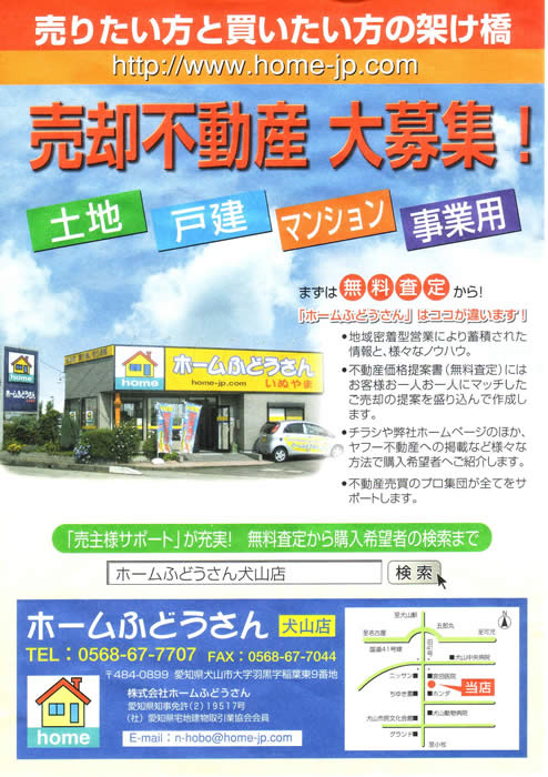 株式会社ホームふどうさんのオフィシャルHPです。H19年6月に三度目のリニューアルを行い、お客様から、多くの反響を得ております。ヤフーへの登録は犬山市内の不動産業者で一番古く、検索エンジン対策は地域1です。 不動産シーズンは犬山市役所へのバナー広告も実施しています。    (無料)
